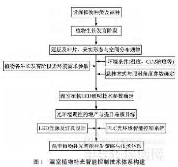 劉文科和楊其長( 2014)提出了人工光植物工廠光環(huán)境智能控制的策略,強調(diào)基于植物光環(huán)境需求特性,建立光照配方( Lighting recipe,LR) ,制定光環(huán)境控制策略( Light environment control strategy,LECS) ,是保證優(yōu)質(zhì)高產(chǎn)前提下實現(xiàn)光能最大利用效率,削減光源能耗的有效方法。實際上,溫室光環(huán)境調(diào)控智能控制需要考慮的因素比人工光植物工廠光環(huán)境智能控制更復雜,控制模型與策略更復雜( 具體技術體系見圖1) 。首先,溫室植物半導體照明智能控制技術需要充分利用設施內(nèi)太陽光能量與資源,實時調(diào)整光照配方中自然光貢獻部分,調(diào)整光照策略,削減能耗。其次,溫室植物半導體照明智能控制技術需要遵循設施內(nèi)園藝作物生長的時空規(guī)律,按照植物生長發(fā)育階段,考慮作物冠層分布、果實分布與葉片角度等要素,注重照射面積與作物冠層的匹配關系,調(diào)整光源懸掛位置、照射角度等控制參數(shù)。最后,溫室植物半導體照明智能控制技術需要大功率紅藍LED 光源裝置作為執(zhí)行機構(gòu),該光源裝置具有較寬的光強控制范圍,較大的照射面積,較好的散熱性能,并具有可調(diào)節(jié)的懸掛能力。從節(jié)能角度而言,劉文科( 2015)論述了LED 照明系統(tǒng)裝備的構(gòu)成( LED 光源及LED 燈、LED 燈懸掛裝置及調(diào)控系統(tǒng)、光環(huán)境智能控制系統(tǒng)) 及其光效提升途徑,重點闡明LED 芯片光質(zhì)構(gòu)建、LED 燈珠發(fā)光角度、LED 陣列排布方式、發(fā)光面性狀設計、散熱系統(tǒng)設計、光環(huán)境智能控制、懸掛裝置及調(diào)控系統(tǒng)、栽培平臺創(chuàng)新與調(diào)控等環(huán)節(jié)的技術途徑。具體而言,溫室植物半導體照明智能控制技術要充分檢測、利用自然光基礎上進行人工補光,基于溫室作物光環(huán)境需求( 光強和光周期) 分階段分強度進行動態(tài)實時補光。